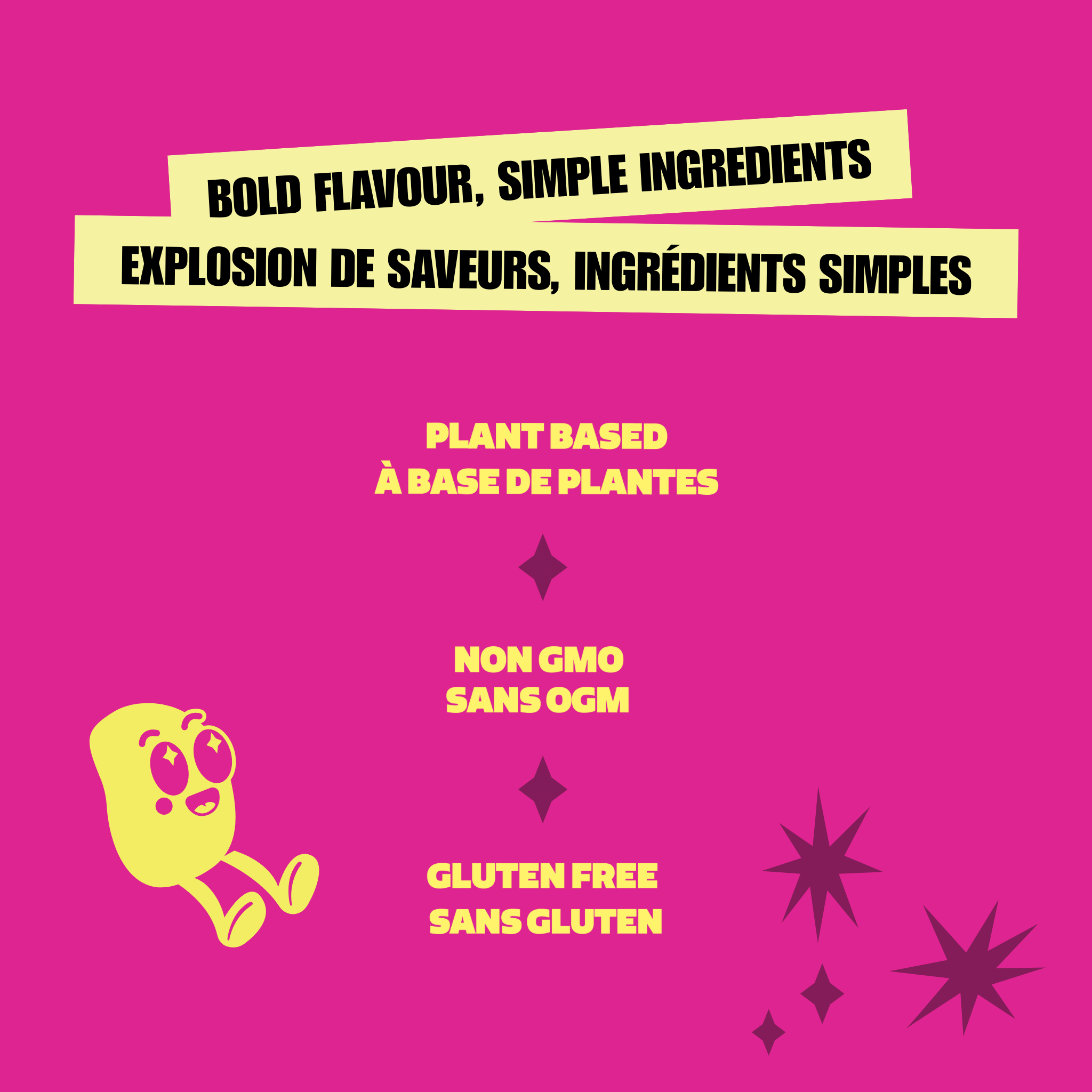 - Saveur audacieuse, ingrédients simples : Élaboré à partir d'une courte liste d'ingrédients savoureux et sans OGM, comme du soya cultivé au Québec et des mélanges d'épices maison.